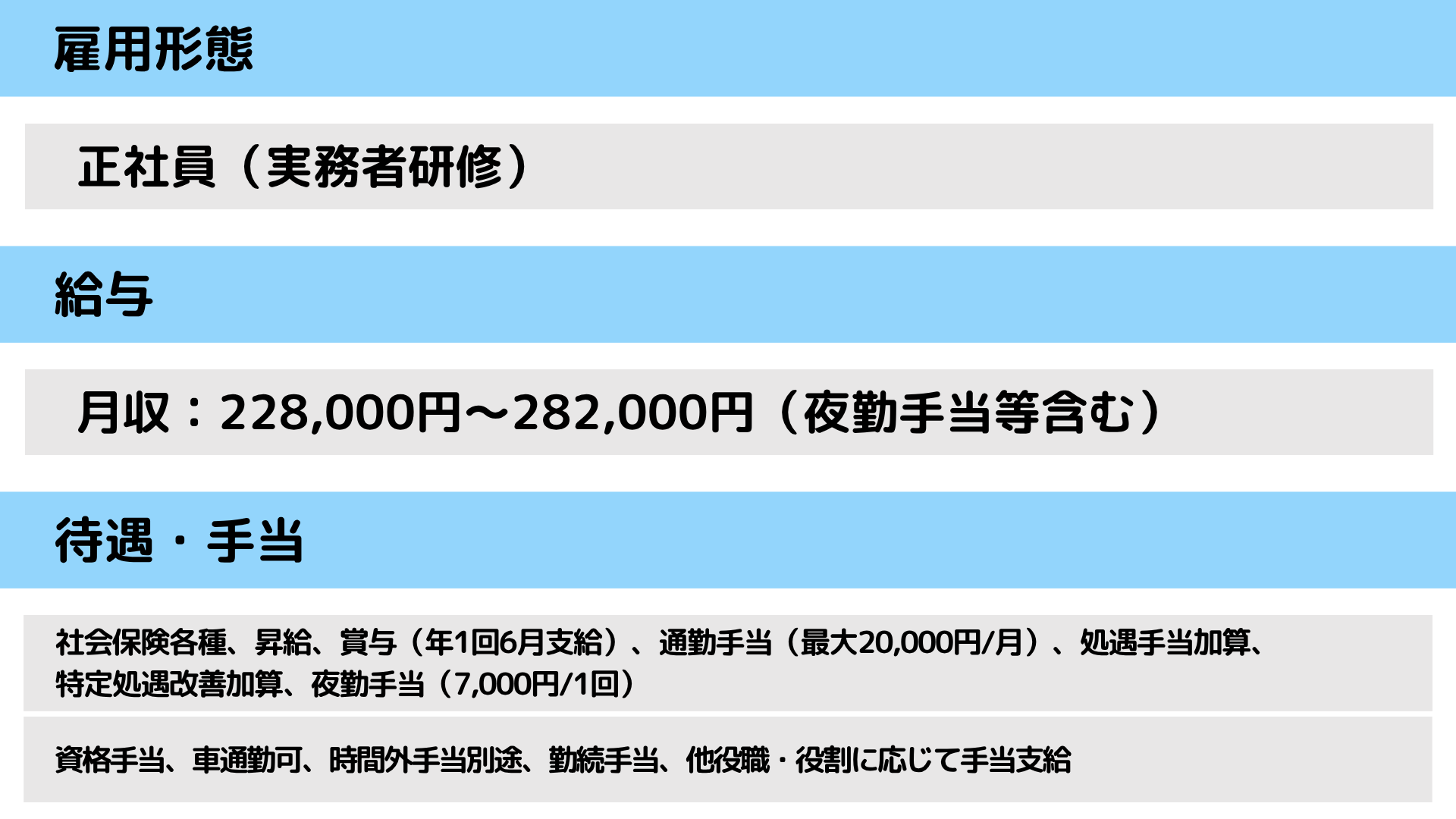 | 待遇・手当 | 社会保険各種、昇給、賞与(年1回)、交通費規定内支給、駐車場代 |