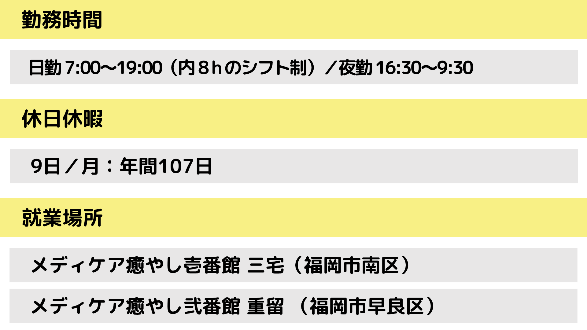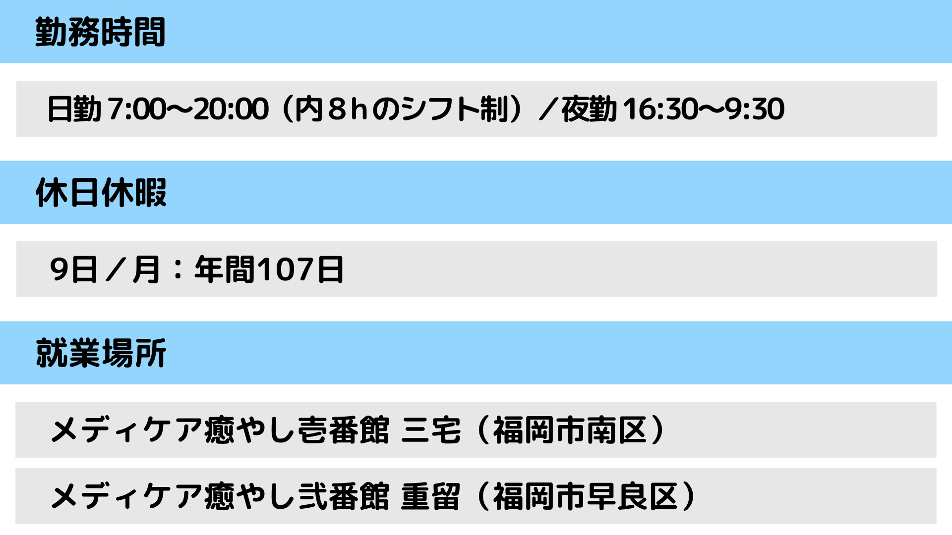 | 就業場所 | メディケア癒やし弐番館重留(募集中) |